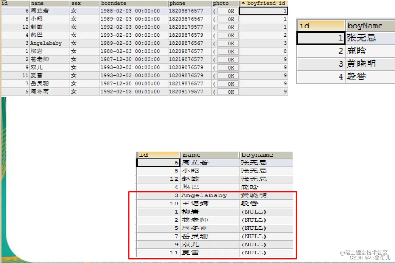 SELECT beauty.id, beauty.`name`, boys.boyName FROM beauty LEFT OUTER JOIN boys ON beauty.boyfriend_id = boys.id;