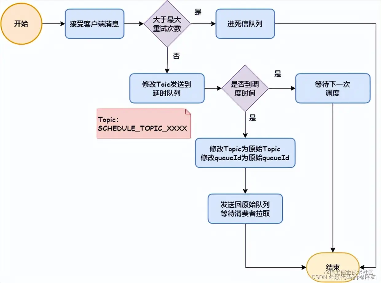 Broker 收到消息后,会把消息重新发送到 CommitLog,发送到 CommitLog 之前,首先会修改 Topic 为 SCHEDULE_TOPIC_XXXX,这样就发送到了延时队列,延时队列再根据延时级别把消息投递到原始的队列,这样消费者就能再次拉取到。流程如下图: