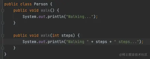 方法重载是在一个类中提供两个或多个独立的方法,名称相同,但参数不同,比如说,方法签名不同。方法的返回类型可能是不同的,也可能不是,所以我们可以重复使用方法的名称。使用方法重载的主要原因是为了减少重复的代码,并且不必记住多个方法名。举个简单的例子,这里有一个人物类。如果我们想让一个人走路,但又想让他走指定的步数,怎么办?我们可以重用这个方法的名称,并加入一个步骤参数,使步行方法可以在有参数或无参数的情况下使用,而不是制定一个新的方法,如walkSteps(int steps)。
