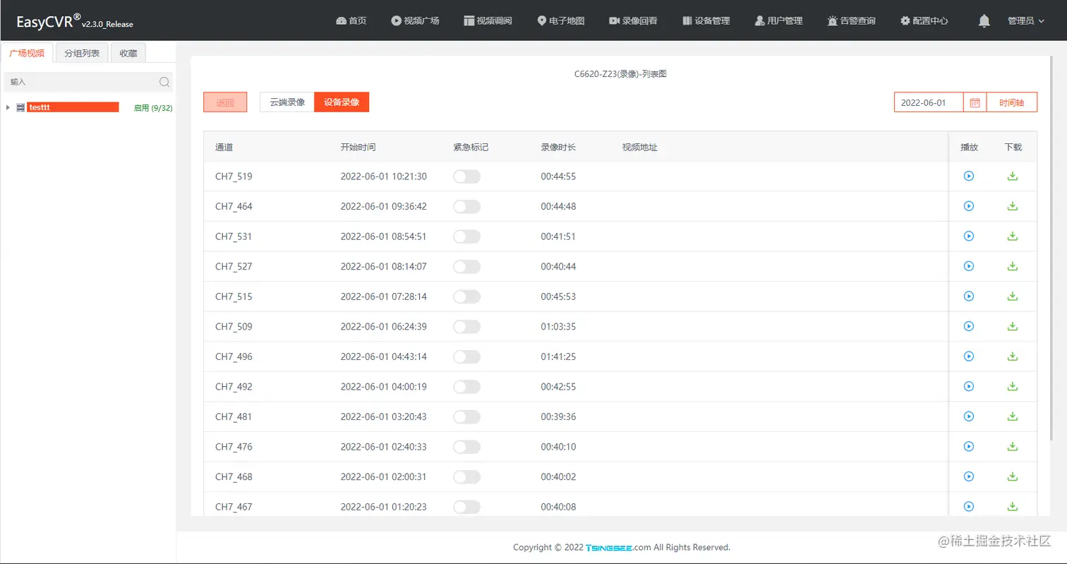 设备接入后查询,设备录像列表显示如图: