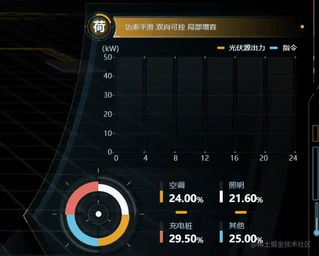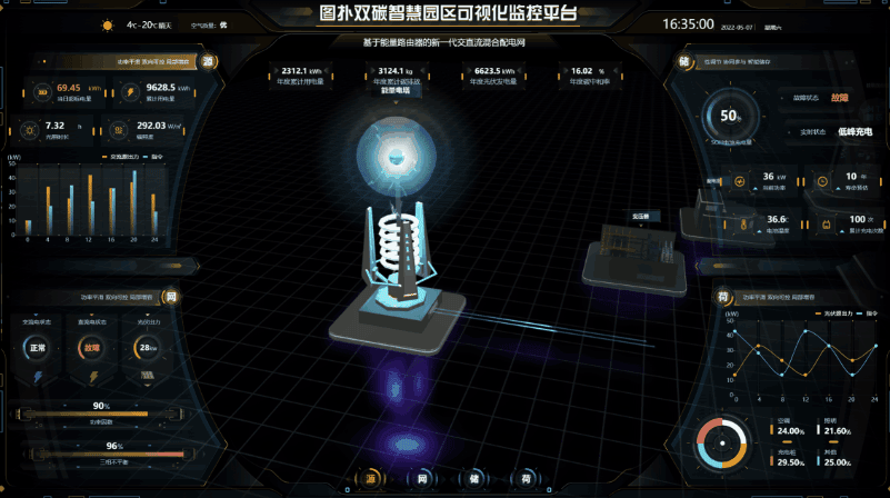 Hightopo 制作的智慧新能源系统以“赛博朋克”风格进行展示,突出能量路由器、变压器、配电室等设备模型,利用 HT 提供的图形化组态 SCADA 能力,以线条流动的方式表达光伏从光能转化为电能、再到设备供电、储能全流程。当日超标电量、累计用电量、光照时长、辐照度分别统计,利于整合分析。利用柱状图动态显示 24 小时内的交流源出力和指令,掌握每日数据变化,提高电力调控能力。