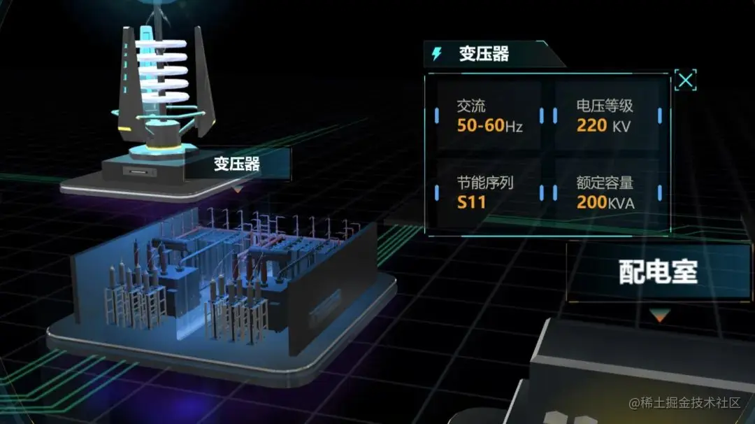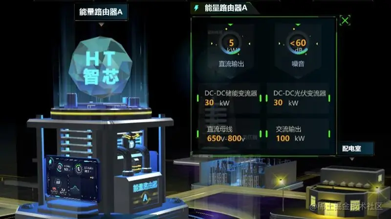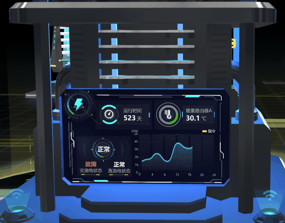 能量路由器是一种集成融合了信息技术与电力电子变换技术、实现分布式能量的高效利用和传输的电力装备。可作为电力局域网与主干网的交互接口,一方面负责局域网内部各个设备的运行和能量管理,同时接收上层电力调度中心的指令并上传局域网的运行状态。通过 HT for Web 渲染出朋克风的效果,并在能量路由器上添加 2D 面板,显示运行时间和状态。