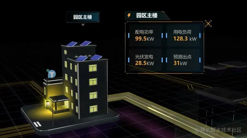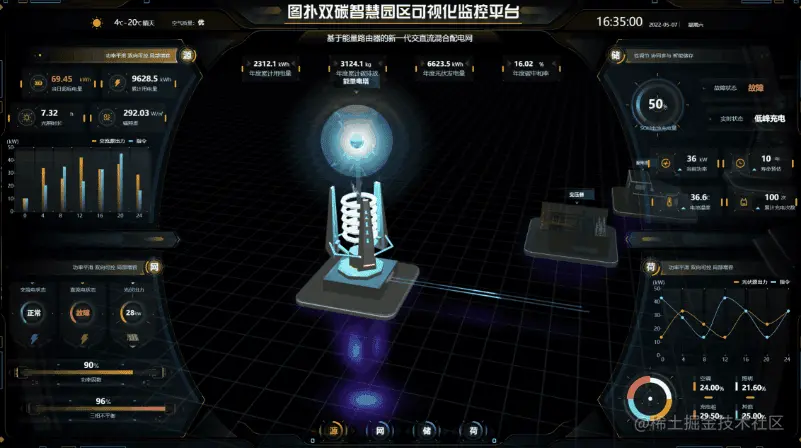 电力塔直接连接到智慧园区的电网,在满足为汽车充能的情况下,项目产生的多余能量会汇入整个园区的用电系统。整合分布式光伏发电系统等技术设备实现电源输入。通过图扑软件可视化场景内的 2D 面板对额定出力、出口电压、额定容量、额定电压、重量、档距进行数据监测,了解“源”侧的电力情况。