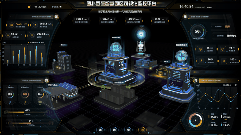 通过智能路由器-新能源微网实现园区、市电、光伏、储能、充电桩、日常负荷的连接和调节,实现“双碳”目标。