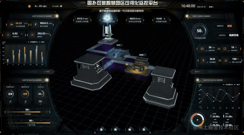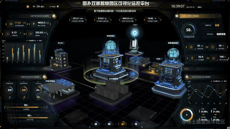 图扑软件利用自主研发引擎 HT for Web 将 Web 智慧“双碳”微电网场景进行数字孪生,有效实现源网荷储一体化管控。整体场景采用了轻量化建模的方式,重点围绕智慧园区电网联通中的源、网、荷、储四方面的设备和建筑进行建模还原,为用户带来“赛博朋克”的视觉体验。采用轻量化重新建模的方式,设计师就有“设计”的发挥空间,展现更多美学创意。支持 360 度观察虚拟园区内源网荷储每个环节的动态数据,通过图扑软件 HT 自带交互,即可实现鼠标的旋转、平移、拉近拉远操作,同时也实现了触屏设备的单指旋转、双指缩放、三指平移操作不必再为跨平台的不同交互模式而烦恼。