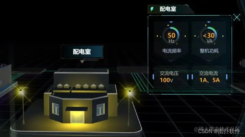 配电室是指带有低压负荷的室内配电场所,主要为低压用户或用电设施配送电能,低压配电室的进线一般是由 35kV 或 10kV 变配电站内的低压开关柜分配出的 400V 电缆。通过图扑软件 HT 2D 面板实现配电室内电流频率、整机功耗、交流电压、交流电流的数据监控,便于运维管理。