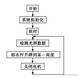 程序算法控制过程为:当控制板上电时,先对系统进行初始化,进行串口,ADC,I/ O 口等相关外设的初始化。 外设初始化后,延时一会,等待系统稳定,便开始正式进入控制流程。 进行智能控制前,单片机通过 ADC 先对传感器进行数据采样,检测光照,再根据采样转换的数字信号进行处理,判断当前阳光的具体位置,然后输出 PWM 脉冲,控制步进电机工作使晾衣杆升降,当晾衣杆到达合适的位置后,MCU 再次通过控制 I/ O 口来控制步进电机的停止,使晾衣杆停止在合适的位置上。 这样晾衣杆控制系统便可以智能地根据光照强度来决定晾衣杆的位置,充分利用阳光晾晒衣服。