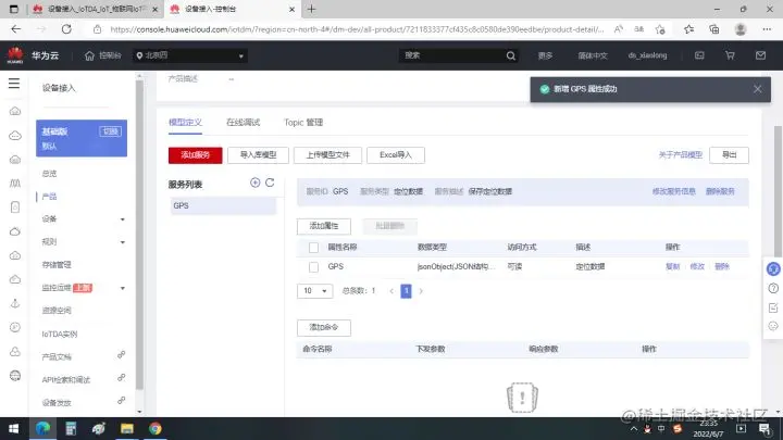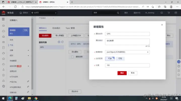 点击创建属性,这里选择JSON类型的数据,上传的GPS有经纬度两个数据,方便保存。