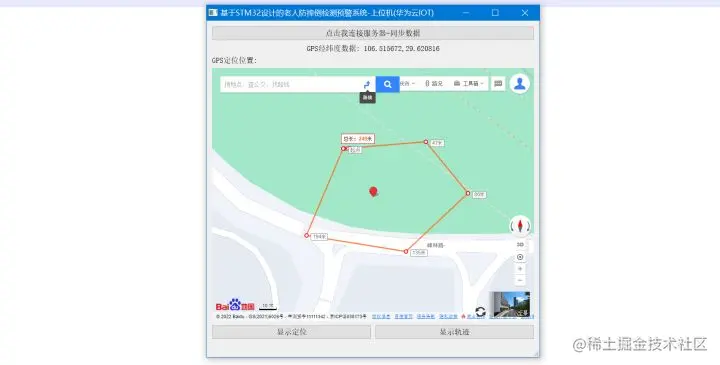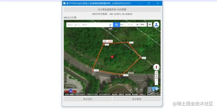 为了方便查看老人摔倒之后的位置,需要通过SIM800C将设备采集的GPS数据上传到云平台服务器保存,就算老人没有跌倒,也可以实时关注老人的位置,在地图上绘制出轨迹线路,方便家人随时联系,了解老人的情况。