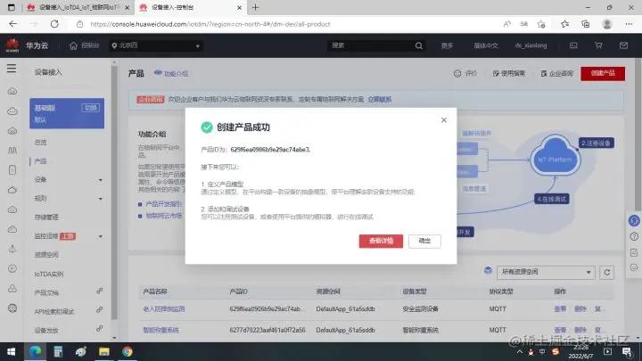 产品创建成功,点击查看详细信息。