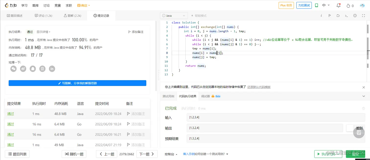 while (i < j && (nums[i] & 1) == 1) i++; //x&1位运算等价于 x %2取余运算,即皆可用于判断数字奇偶性。