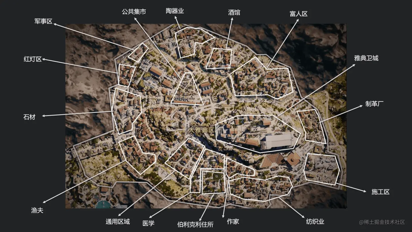 典型的例子如城市的规划:卫城、富人区、贫民窟、文化区、妓院、农耕区等。