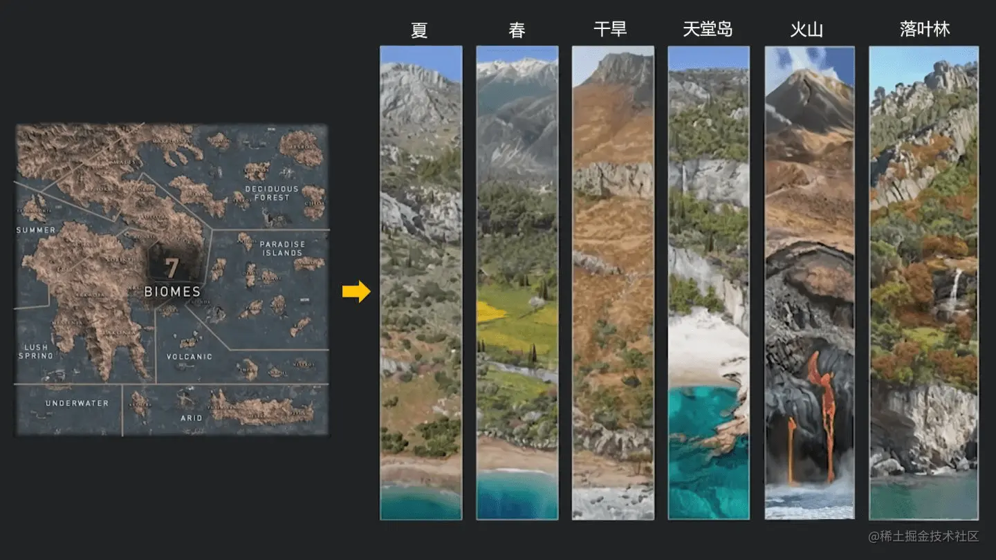 为了确保游戏世界的视觉多样性,尽量保证两块相邻区域的主要生态系统类型要有具体的对比性。