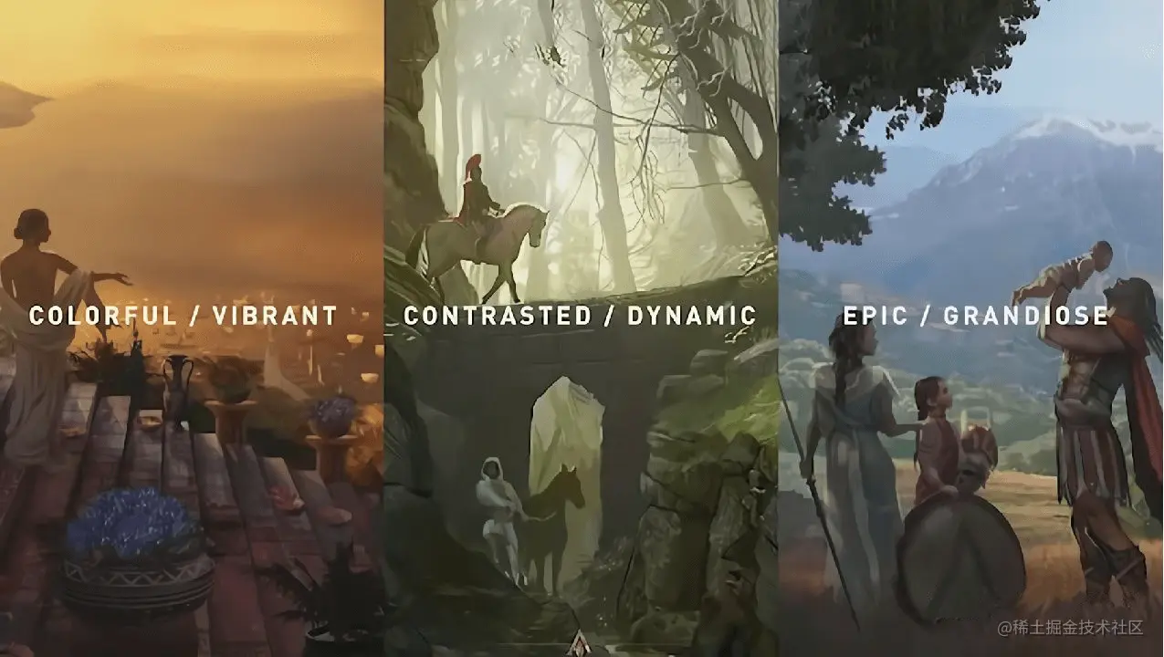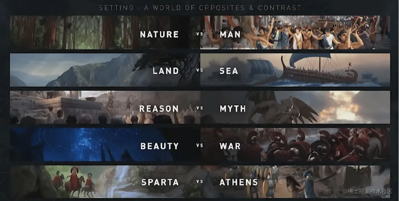 “对比”是整个游戏世界构成的重要艺术指导原则,玩家能在游玩中感受到这种变化,到处充满着对比:自然与人、陆地和海洋、理性和神话、美丽和战争、斯巴达和雅典。