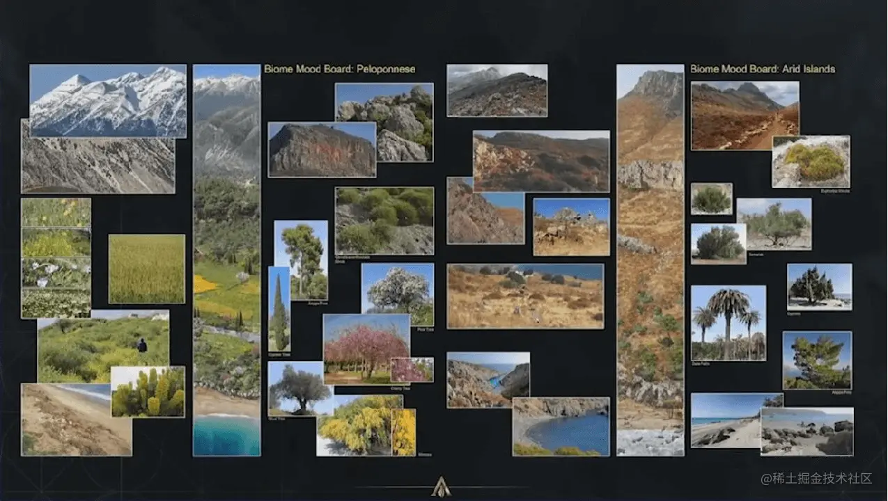 确定视觉风格和支柱。不是常见的希腊世界中灰蒙蒙的、棕色的、低饱和、单色的、平坦的。而是一个具有生态系统多样性的世界,充满着各种茂密生物群落、蓝天碧水、人文景观等元素,这是我们想要呈现给玩家的希腊。