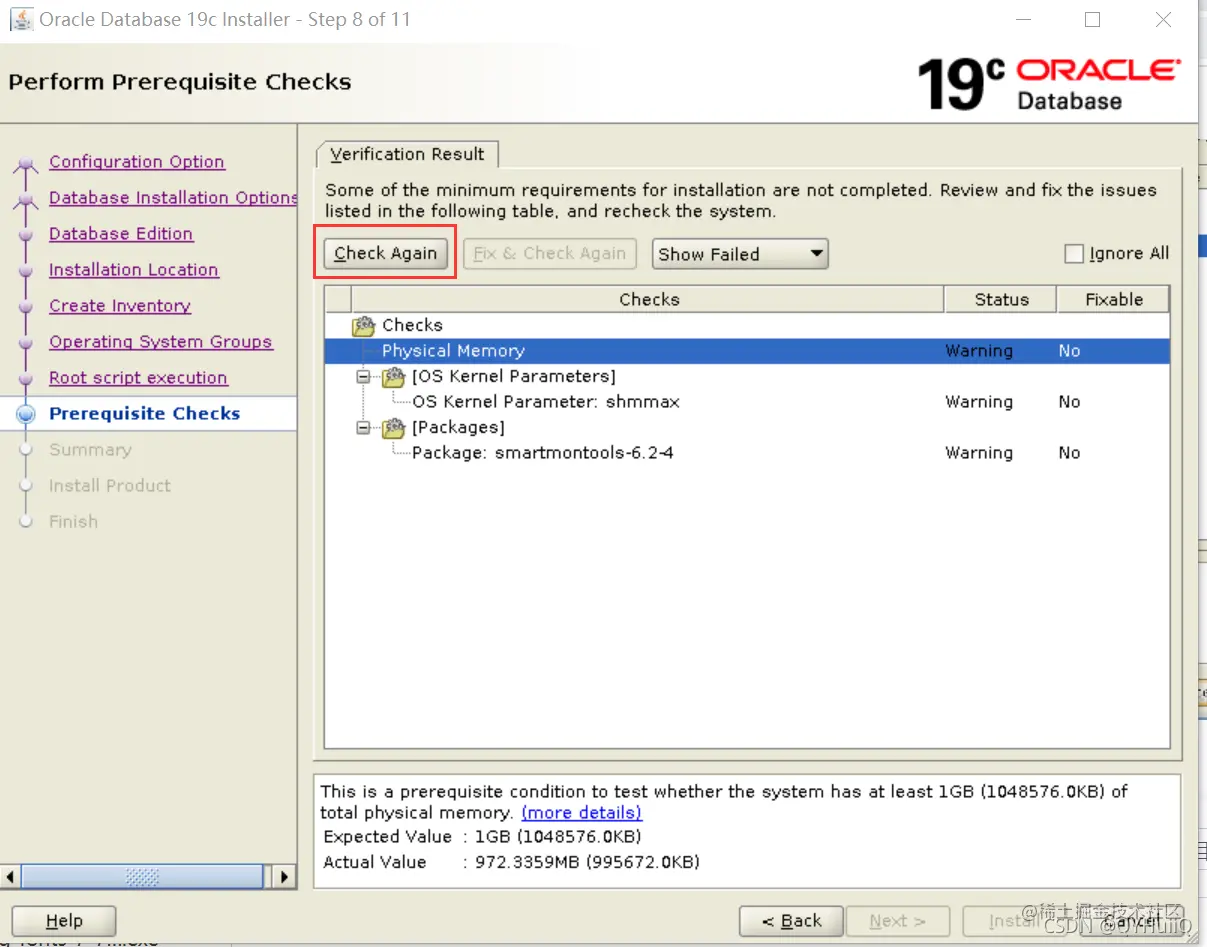 对于shmmax的值经过调整之后并没有什么效果还改成了原来的值,最后变成了swap的报错,按照这篇(oracle 19c安装检查过程中swap size failed_QYHuiiQ-CSDN博客)操作调整swap之后check成功。