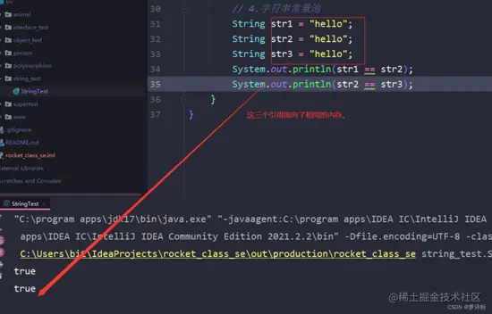 下图是两个引用指向了同一块地址空间,和字符串的常量池有关