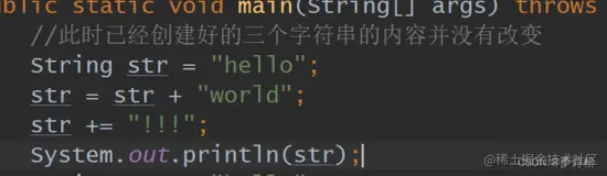 这里的不可变指的是" hello " , " world " , " helloworld " , " !!! " , 以及拼接后的"helloworld!!!"这些已经创建好的字符串对象,这些对象一旦声明后就无法修改其内容,但是引用是可以改变的,一会指向hello,一会指向helloworld,一会指向hello world!!!,这都是可以的