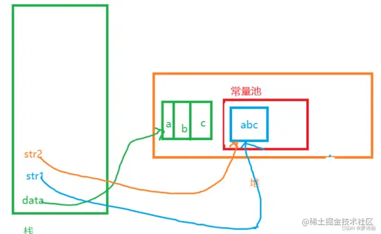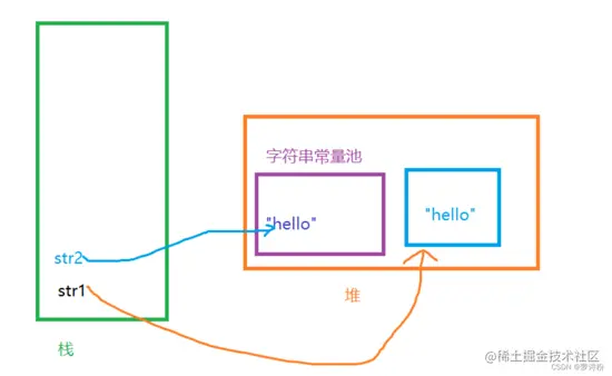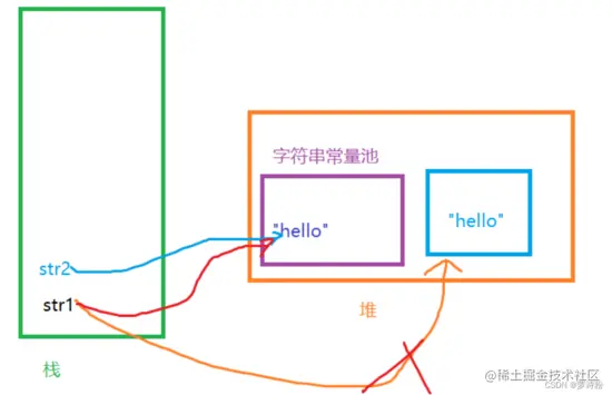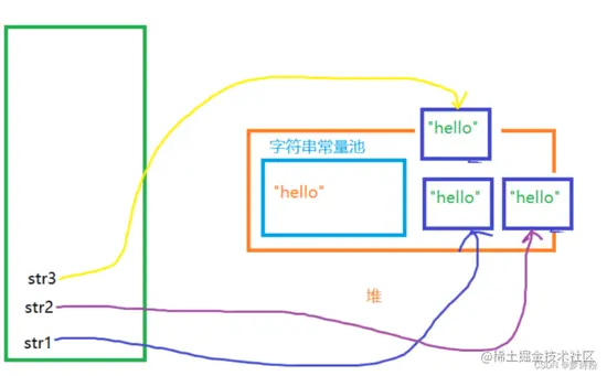 程序都是从右向左执行的,此时第一行代码的右边就是一个字符串常量,也是一个字符串对象,所以先在常量池中开辟一块空间,然后新建一个字符串对象存入,程序再往左执行,遇到new关键字,此时新建一个对象存入堆中,然后str1 指向堆中的对象,在指向第二行第三行代码时,发现常量池中已经存在该对象,不再新建,遇到new关键字就新建对象,内存图如下: