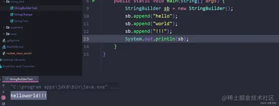若需要频繁的进行字符串的拼接,使用StringBuilder类的append方法,这里只产生了一个对象,一会变成hello,一会变成hello world