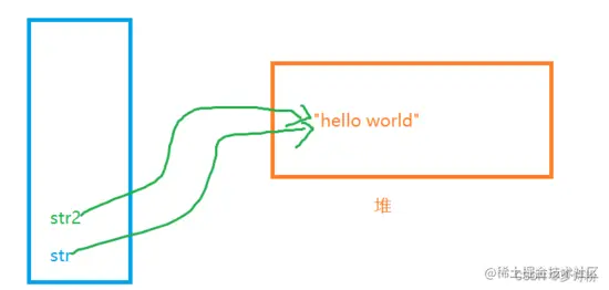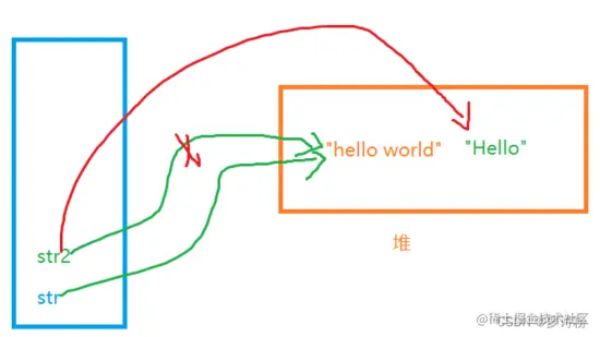 若此时让str2 = “Hello”;此时对str的输出并没有影响,因为被" "括起来的Hello也是一个字符串对象,说明此时在堆上新开辟了一块空间,而此时str2保存的就是新对象的地址空间,对str没有影响
