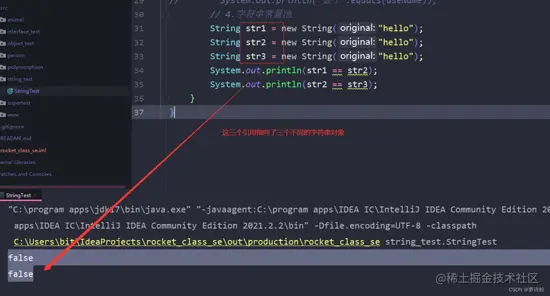 因为intern方法是有返回值的,此时str1只是调用了intern方法,并没有接收返回值,所以str1还是指向堆中的对象,str2指向常量池中的对象,所以返回false;