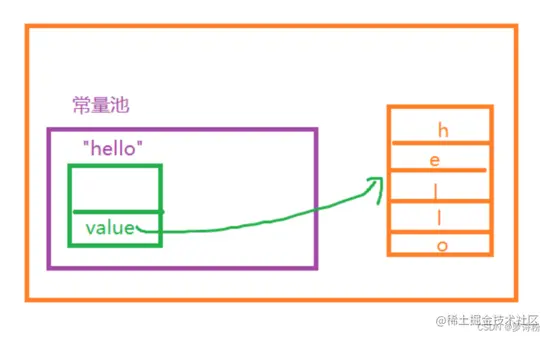 此时这既是一个字符串的字面量,也是字符串的对象,为了方便理解,画个图,此时是为了方便理解我们暂时先认为它储存在堆上,其实实在方法区中存放