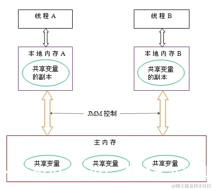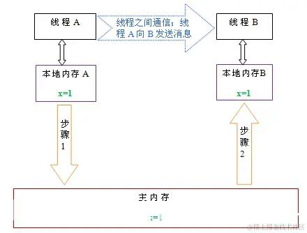从整体来看,这两个步骤实质上是线程A在向线程B发送消息,而且这个通信过程必须要经过主内存。JMM通过控制主内存与每个线程的本地内存之间的交互,来为java程序员提供内存可见性保证。