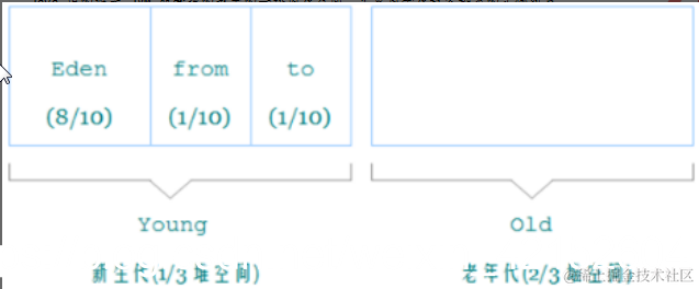 默认的,新生代 ( Young ) 与老年代 ( Old ) 的比例的值为 1:2 ( 该值可以通过参数 –XX:NewRatio 来指定 ),即:新生代 ( Young ) = 1/3 的堆空间大小。老年代 ( Old ) = 2/3 的堆空间大小。其中,新生代 ( Young ) 被细分为 Eden 和 两个 Survivor 区域,这两个 Survivor 区域分别被命名为 from 和 to,以示区分。
