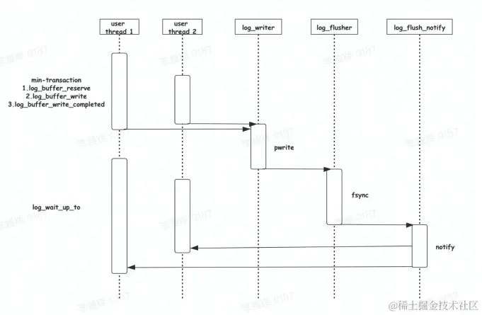 事务并发修改数据,产生 Redo Log 后把日志写到 log buffer中,然后后台 log_write 会将日志写到系统缓存中,然后 log_flusher 会把缓存中的日志写到磁盘中,写完后修改就不会丢了,最后通知用户线程完成了,在这之前用户线程是阻塞的,由此可以看出 redo 日志的持久化会影响 MySQL 性能