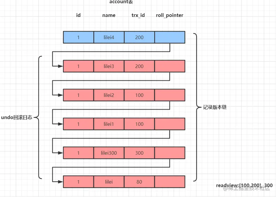 注意这里的版本记录不是真实物理存在的,真实物理存在只有最新的一条记录,其他历史记录都是通过回滚日志推导出来的。