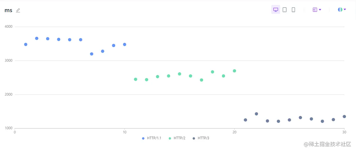 最后的测试结果如下, HTTP/1.1 平均在 3500 ms, HTTP/2 平均在 2500 ms, 而 HTTP/3 平均在 1300 ms, 可以看到 HTTP/3 带来的性能提升还是很明显的。