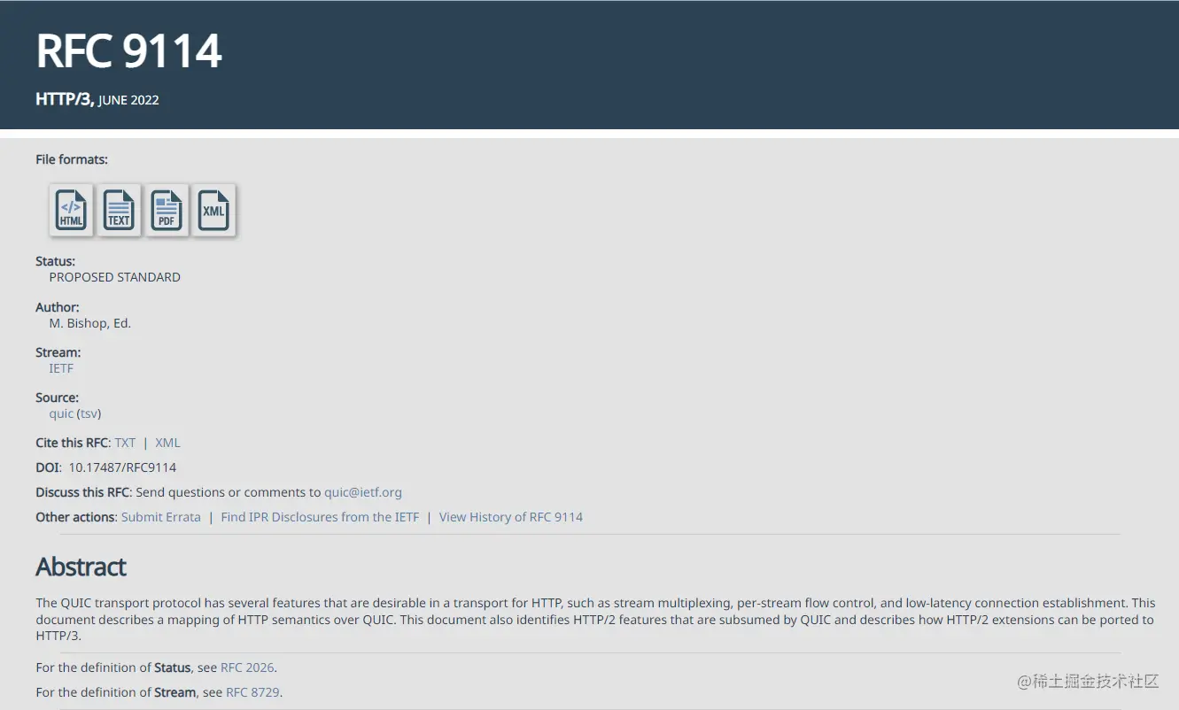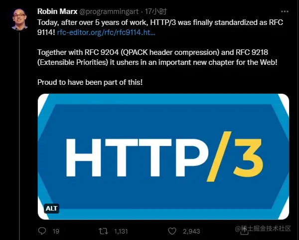 经过了多年的努力,在 6 月 6 号,IETF (互联网工程任务小组) 正式发布了 HTTP/3 的 RFC, 这是超文本传输协议(HTTP)的第三个主要版本,完整的 RFC 超过了 20000 字,非常详细的解释了 HTTP/3。
