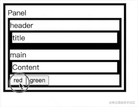 我们有五个部分,外层的 pannel 组件,header 组件,title 组件,main 组件还有 content 组件。我们在随便一层组件中执行 color 切换函数,因为 setColor 方法已经通过 context 传递进去了。样式很简单,代码如下: