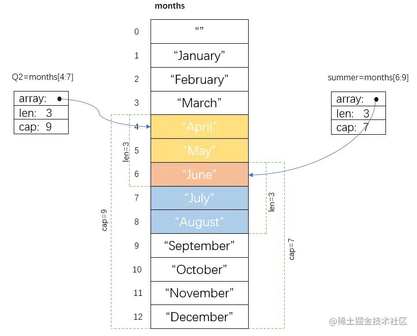 月份名称字符串数组与其对应的两个元素重叠的 slice 图示
