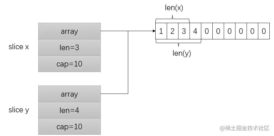 创建切片 y 为切片 x 追加一个元素 4 后,底层数组结构如下图所示