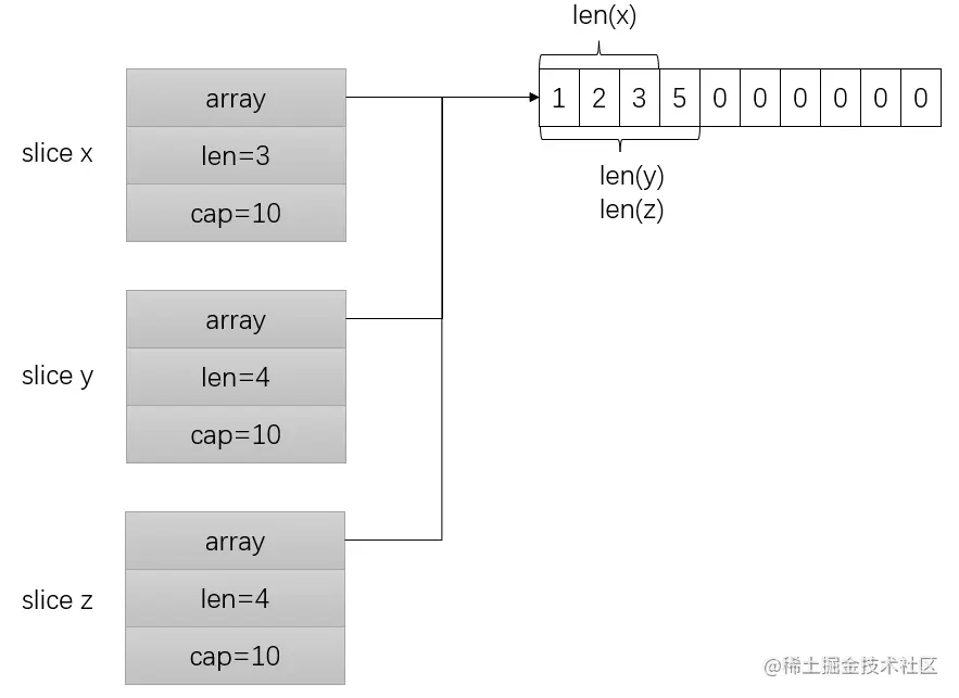 - Go 的切片,底层是一个三元组。指针指向一块连续的内存,长度是已有成员数,容量是最大成员数。切片时,一般并不会申请新的内存,而是对原指针进行移动,然后和新的长度、容量组成一个切片类型值返回。也就是说,Go 的切片操作通常会和生成该切片的切片或数组共享内存。