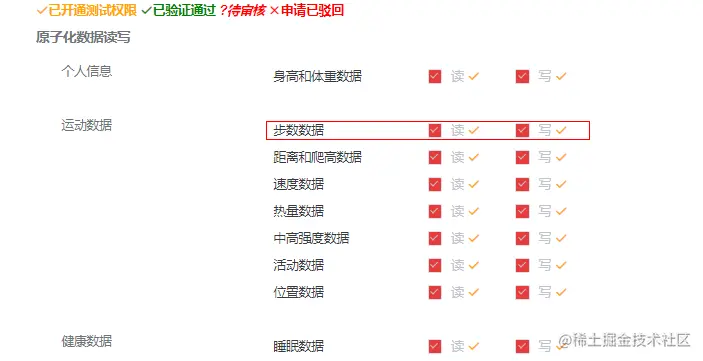 (1)检查Health Kit 联盟卡片上是否申请了“读取历史数据”权限,此权限在服务器应用中可见