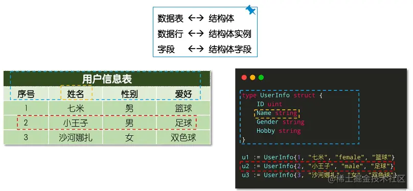 u1 := UserInfo{1, "七米", "男", "篮球"}