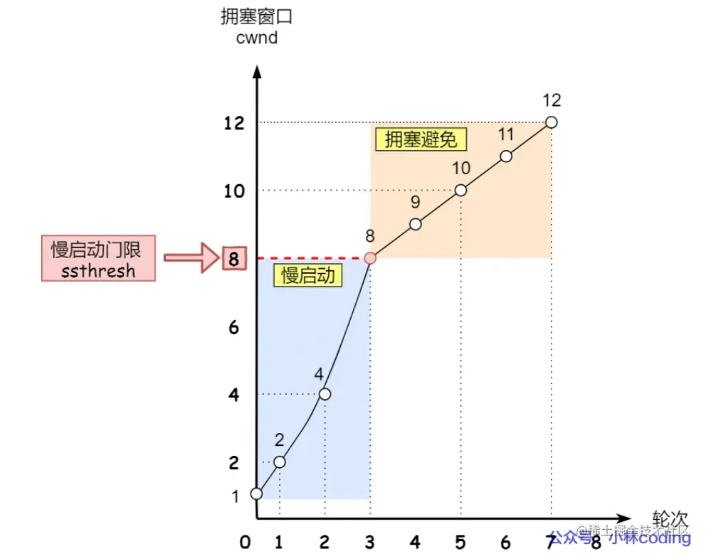 进入拥塞避免算法后,它的规则是:每当收到一个 ACK 时,cwnd 增加 1。