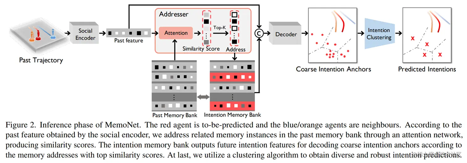 为了实现轨迹预测,以前的大多数方法都采用基于参数的方法,将所有看到的过去-未来实例对编码为模型参数。但是,通过这种方式,模型参数来自所有可见实例,这意味着大量不相关的可见实例也可能涉及预测当前情况,从而干扰性能。为了在当前情况和所见实例之间提供更明确的联系,我们模仿神经心理学中的回顾性记忆机制并提出了 MemoNet,这是一种基于实例的方法,通过在训练数据中寻找类似的场景来预测代理的运动意图。在 MemoNet 中,我们设计了一对记忆库来明确存储训练集中的代表性实例,充当神经系统中的前额叶皮层,以及一个可训练的记忆寻址器,以自适应地搜索记忆库中具有相似实例的当前情况,就像基底节。在预测过程中,MemoNet 通过使用内存寻址器对内存库中的相关实例进行索引来调用先前的内存。我们进一步提出了一个两步轨迹预测系统,第一步是利用 MemoNet 预测目的地,第二步是根据预测的目的地完成整个轨迹。实验表明,所提出的 MemoNet 在 SDD/ETH-UCY/NBA 数据集上比之前的最佳方法提高了 20.3%/10.2%/28.3% 的 FDE。实验还表明,我们的 MemoNet 能够在预测期间追溯特定实例,从而提高可解释性。