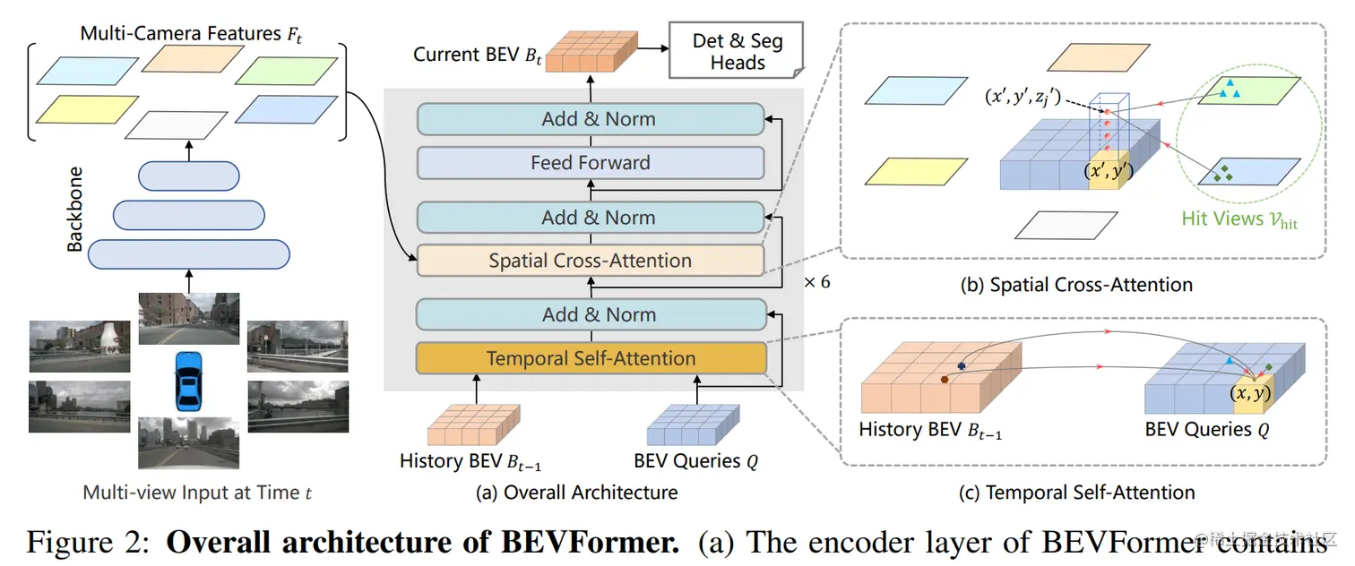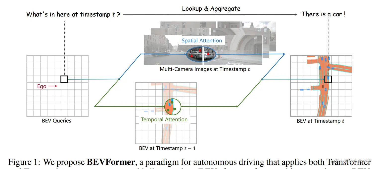 论文简介:In a nutshell, BEVFormer exploits both spatial and temporal information by interacting with spatial and temporal space through predefined grid-shaped BEV queries. / 简而言之,BEVFormer 通过预定义的网格形 BEV 查询与空间和时间空间交互,利用空间和时间信息。