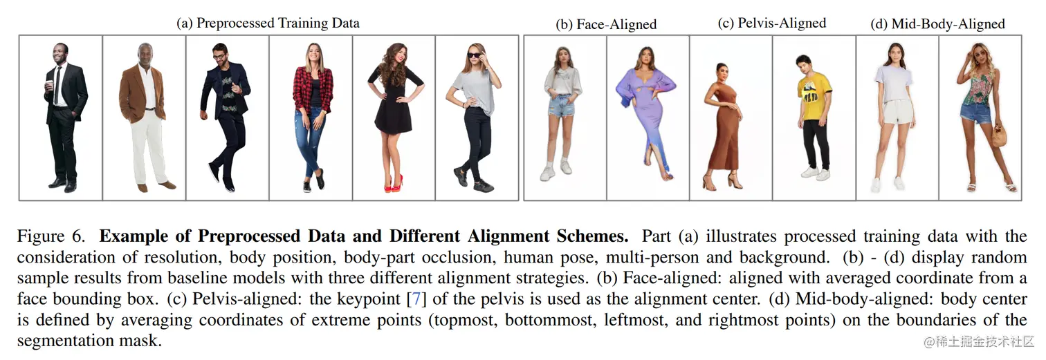 无条件约束的人物图像生成是视觉和图形学中的一项重要任务,它使创意产业的各种应用成为可能。该领域的现有研究主要集中在“网络(结构)工程”,例如设计新的组件和目标函数。这项工作以数据为中心,研究了“数据工程”中的多个关键方面,我们认为这将补充当前的实践。为了促进全面研究,我们收集并注释了一个包含超过 23 万个样本的大规模人体图像数据集,这些样本捕获了不同的姿势和纹理。借助这个大型数据集,我们严格研究了基于 StyleGAN 的人类生成数据工程中的三个基本因素,即数据大小、数据分布和数据对齐。广泛的实验揭示了几个有价值的观察结果。这些方面: 1)需要大规模数据,超过 40K 图像,以使用 vanilla StyleGAN 训练高保真无条件人类生成模型。 2)与长尾对应物相比,平衡的训练集有助于提高稀有面部姿势的生成质量,而简单地平衡服装纹理分布并不能有效地带来改进。 3) 具有用于对齐的身体中心的人类 GAN 模型优于使用面部中心或骨盆点作为对齐锚点训练的模型。此外,还给出了一个模型仓库和人工编辑应用程序,以促进社区未来的研究。