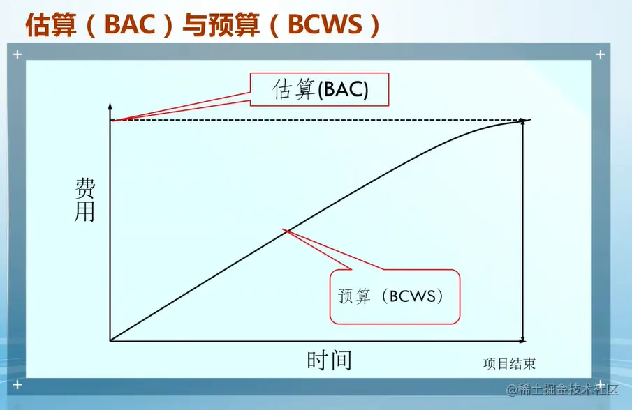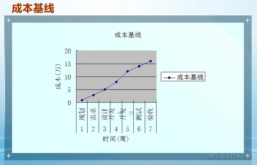 不管采用什么预算分配方法,最后将总的成本分配到具体任务中形成预算,那么这个图是一个预算体现,既成本基线。