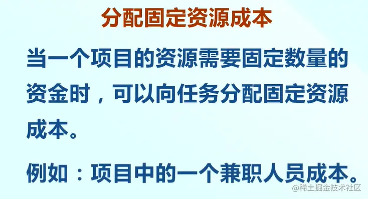 当一个项目的资源需要固定数量的资金时,客户可以向任务分配固定资源成本。例如:项目中的一个兼职人员为固定资源成本,为2万元。