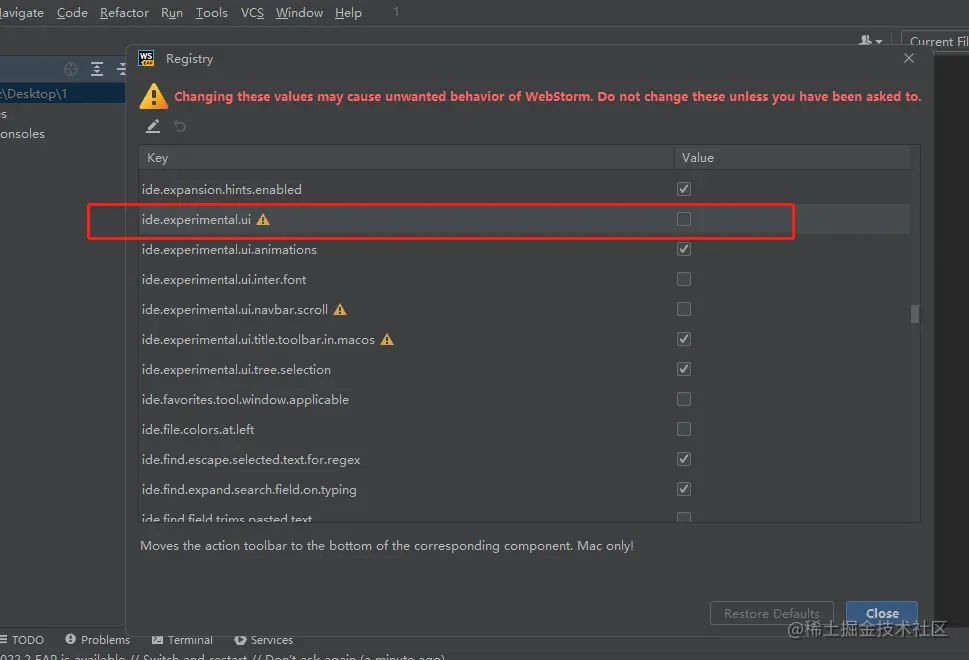 点击第一个搜到的,之后找到这个配置,ide.experimental.ui,把他勾选上。重启之后,就可以体验啦!