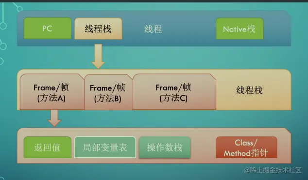 栈:线程栈,也叫Java方法栈,每启动一个线程就会创建一个栈,如果使用了JNI方法,就会分配一个单独的本地方法栈。线程执行过程中,一般会有多个方法组成调用关系,如方法A调用方法B,每执行到一个方法,就会创建一个栈帧。