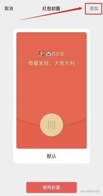 第三步: 第一步领取的红包封面即可在红包页面进行选择,而点击右上角的【添加】,可以用另一种方式添加红包封面。