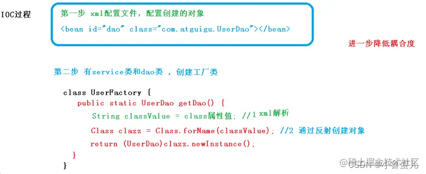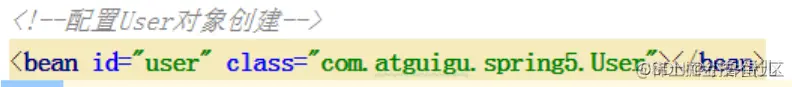 <!--1 service 和 dao 对象创建--> <bean id="userService" class="com.atguigu.spring5.service.UserService"> <!--注入 userDao 对象 name 属性:类里面属性名称 ref 属性:创建 userDao 对象 bean 标签 id 值 --> <property name="userDao" ref="userDaoImpl"></property> </bean> <bean id="userDaoImpl" class="com.atguigu.spring5.dao.UserDaoImpl"></bean>