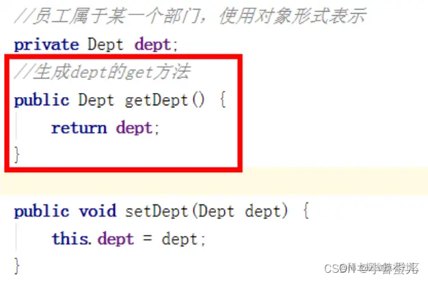 //员工类 public class Emp { private String ename; private String gender; //员工属于某一个部门,使用对象形式表示 private Dept dept; public void setDept(Dept dept) { this.dept = dept; } public void setEname(String ename) { this.ename = ename; } public void setGender(String gender) { this.gender = gender; } }